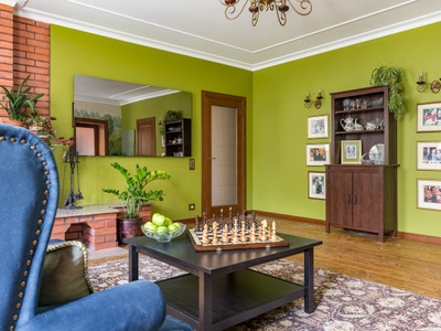 Стиль интерьера – яркая неоклассика: с традиционным кирпичным камином соседствует колоритный пейзаж на стене и мебель в английском духе. Ощущение уюта поддерживают двери Galant в натуральном шпоне. Полотна дополняет стекло с алмазной гравировкой: благодаря этому декоративному элементу интерьер становится ещё изысканнее.
