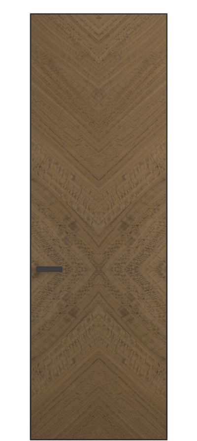 Полотно Рифт в скрытом алюминиевом коробе становится полноценным элементом декора. В коллекции представлено 9 моделей дверей в высоте до 3 метров. Рисунок раскладки шпона варьируется от простого до сложного. «Рубашка» для каждого полотна подбирается вручную по цвету, текстуре и фактуре.