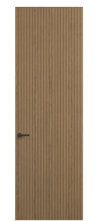 Селект — коллекция минималистичных дверей с фрезеровкой по натуральному шпону. Рельеф на поверхности полотна создаёт игру света и тени, добавляя пространству динамичности и визуального объёма. Двери Селект в сочетании со стеновыми панелями и мебельными фасадами, повторяющими лаконичный дизайн, создают единое стилевое решение.