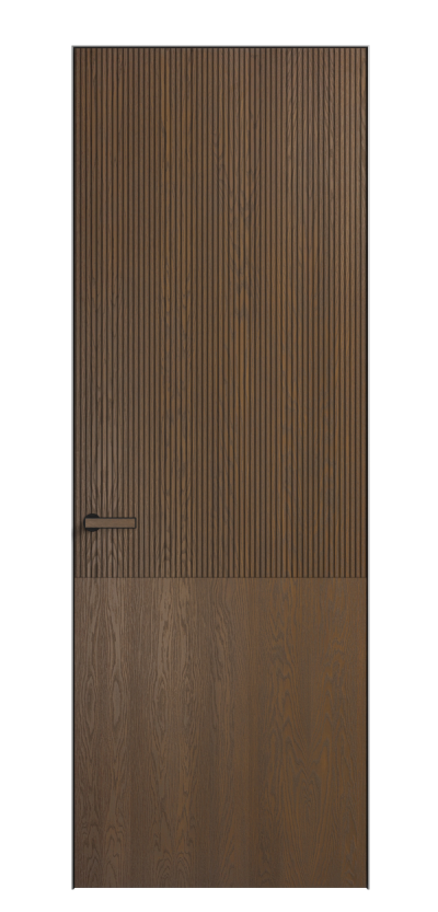 Это полотна с рельефной фрезеровкой. Этот прием делает интерьер объемным, тактильным, вносит интересную текстуру и создает современный образ. Волнистый рельеф может быть выполнен по ламелям из массива дуба в древесных матовых отделках, либо исполнен по натуральному и экологически безопасному материалу — ХДФ, покрытому гладкой эмалью актуальных оттенков.